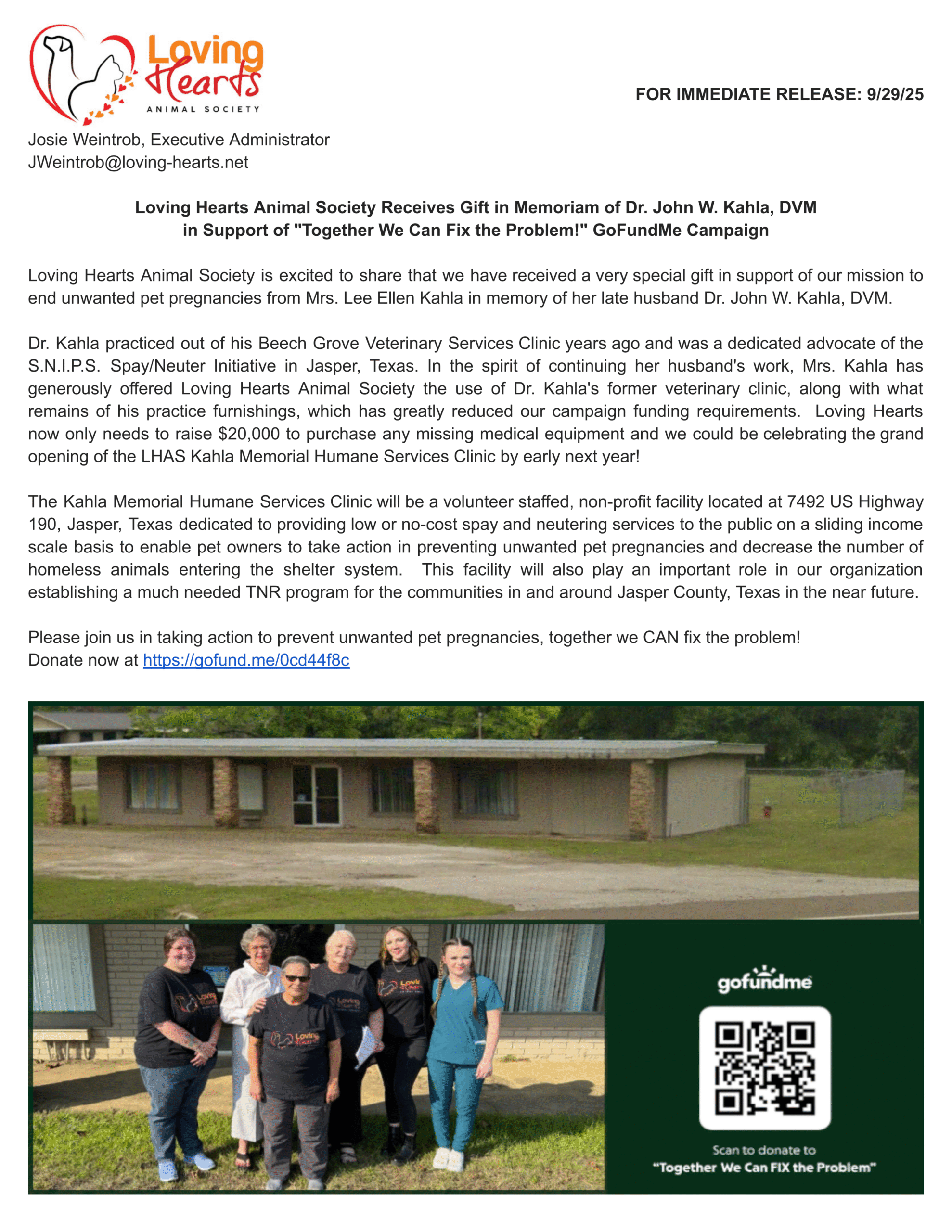 Press Release 9/29/25: Kahla Memorial Humane Services Clinic