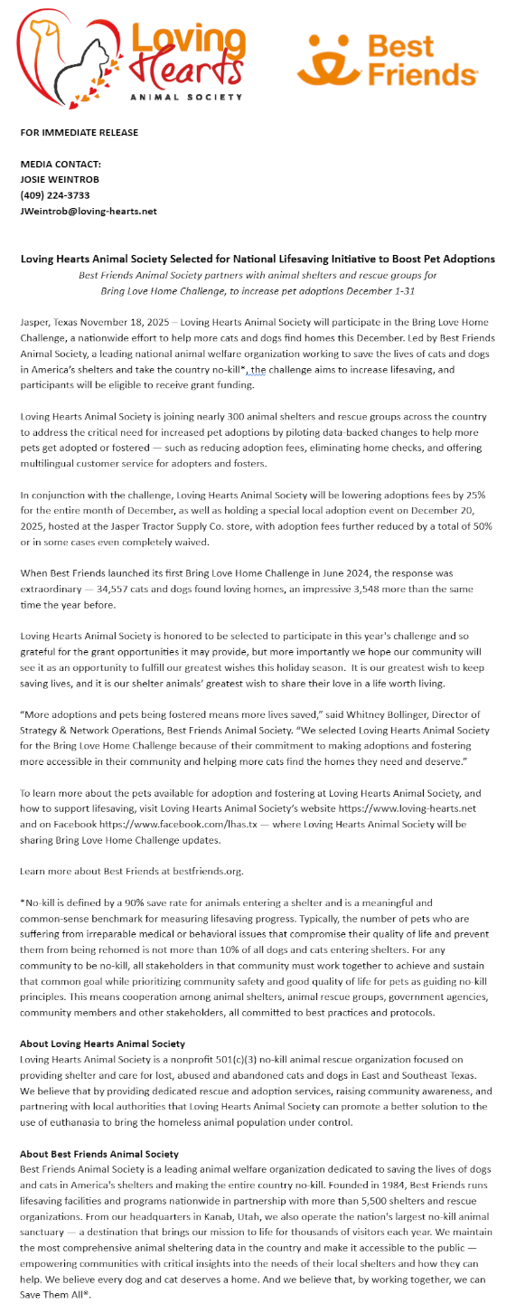 Press Release 11/18/25: Best Friends Bring Love Home Challenge
